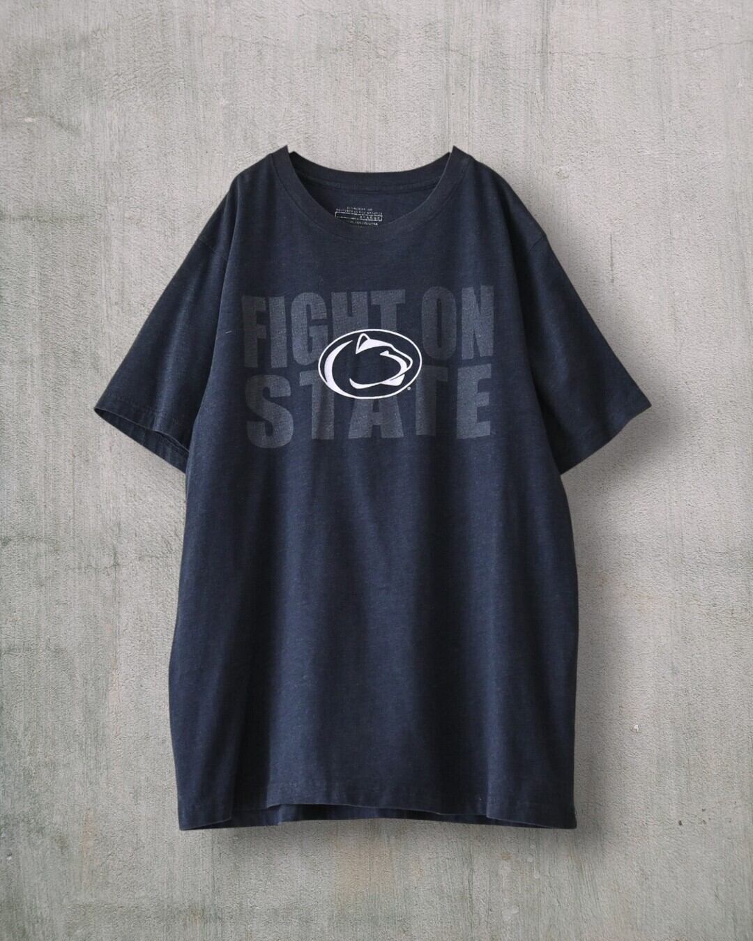 「FIGHT ON STATE」はペンシルベニア州立大学(Penn State University)の有名な応援スローガン。中央にNittany Lions(ニタニー・ライオンズ)のアイコン(猫の頭)。薄れて読みにくいが、「Established 1985」「Designed in Los Angeles」の表記。