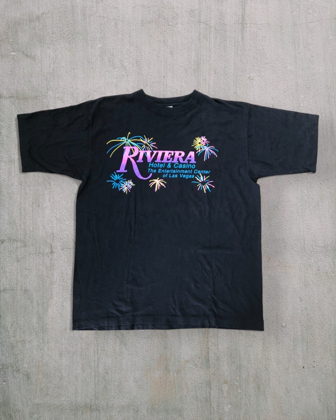 シングルステッチ。ラスベガス物!ネバダ州ラスベガスの老舗カジノホテル「Riviera(リビエラ)」のオリジナルTシャツ。カラフルな花火とグラデーションロゴが映える派手なデザインで、観光土産ながら古着市場でも映える一枚。