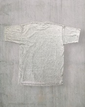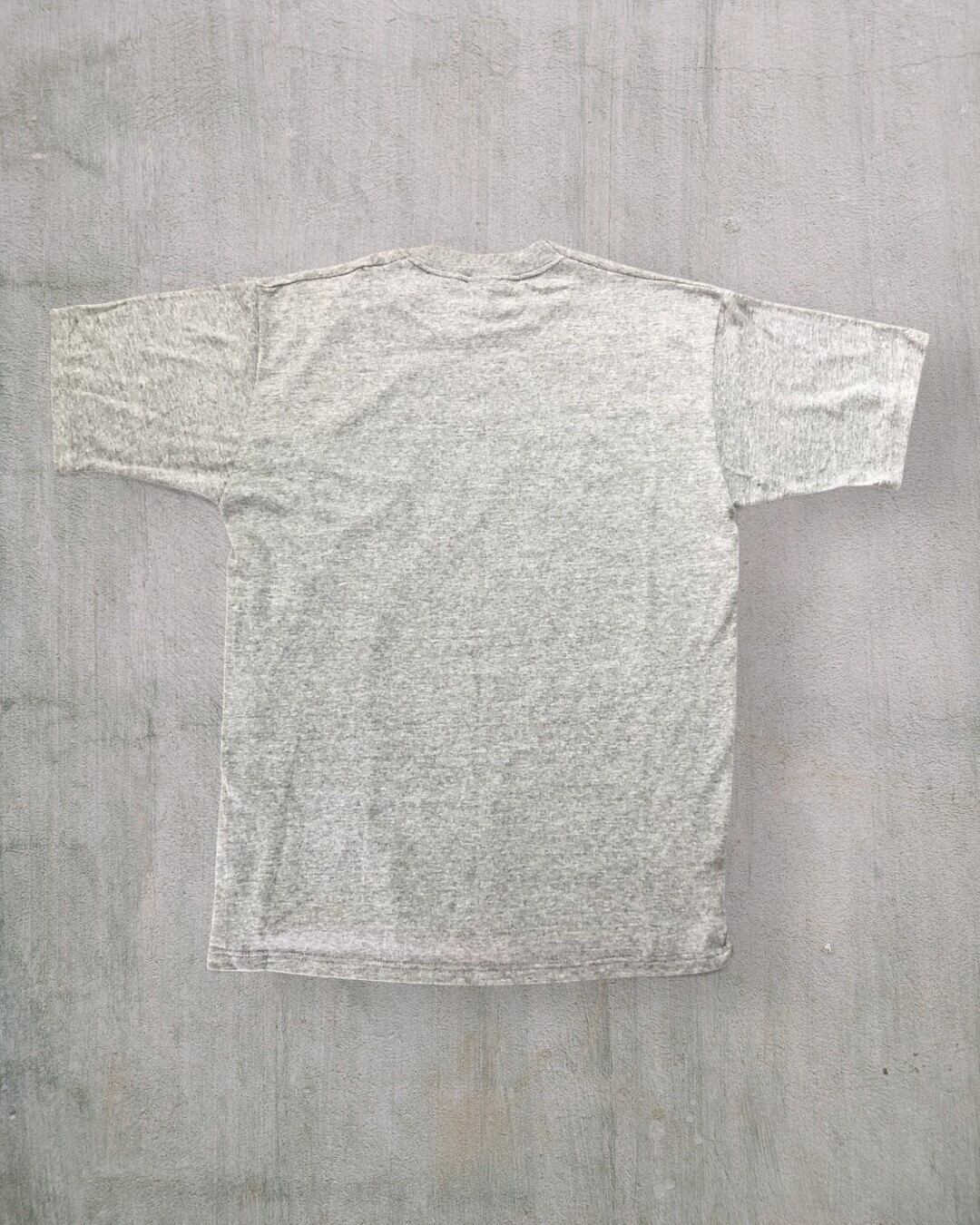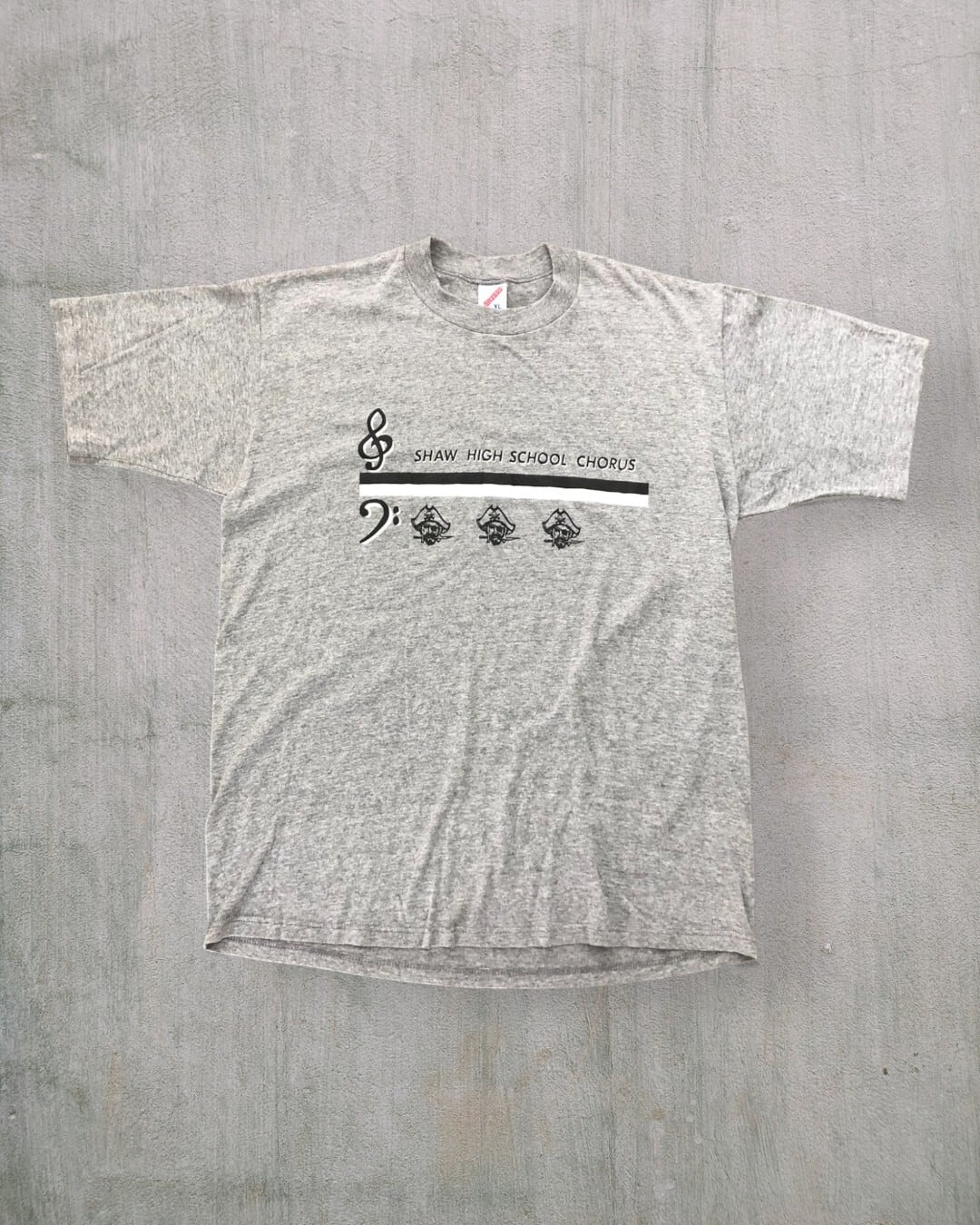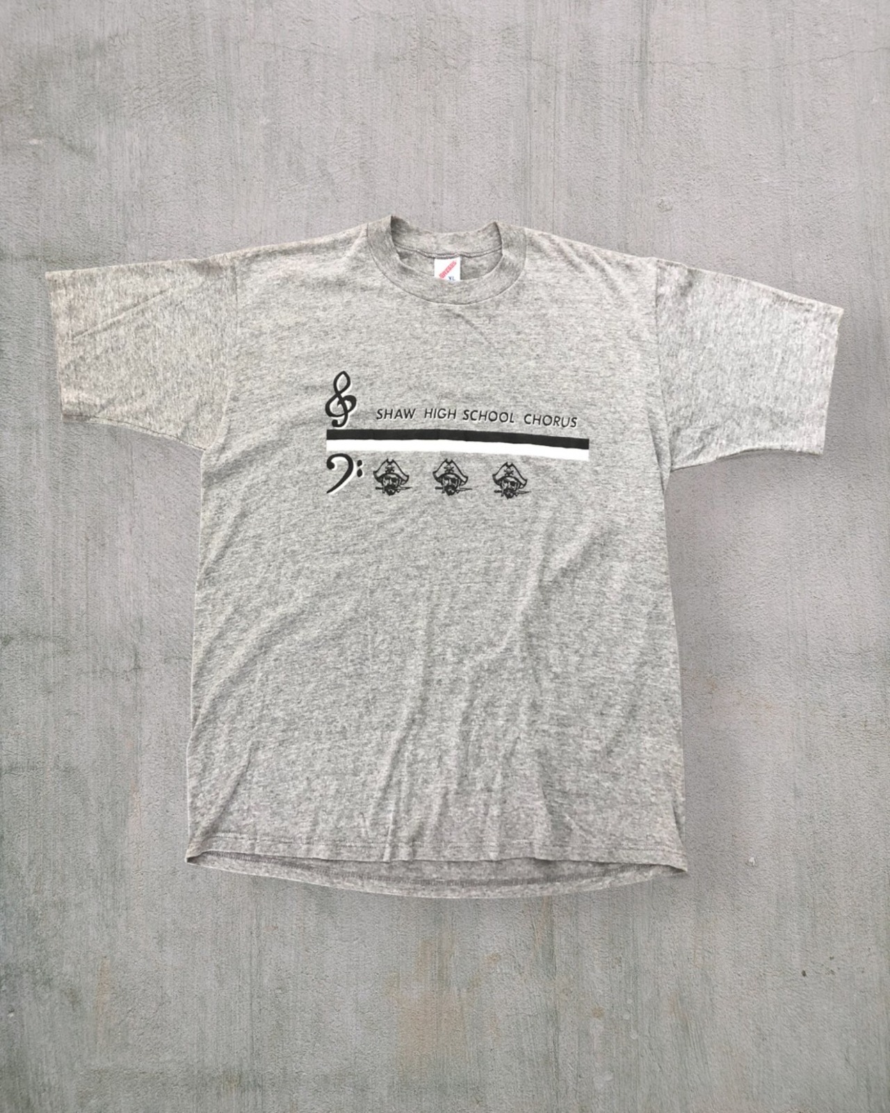 シングルステッチ。made in USA。アメリカの高校「Shaw High School」の合唱部(Chorus)Tシャツ。グレー杢のボディに音楽記号(ト音記号・ヘ音記号)とマスコットのようなキャラクターが並んだシンプルなデザイン。地域・学校限定のスクールTシャツで、市場流通はかなり少ないアイテム。